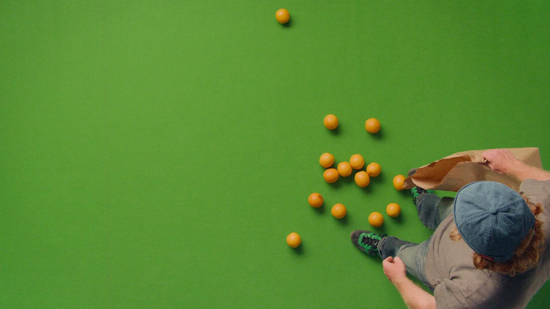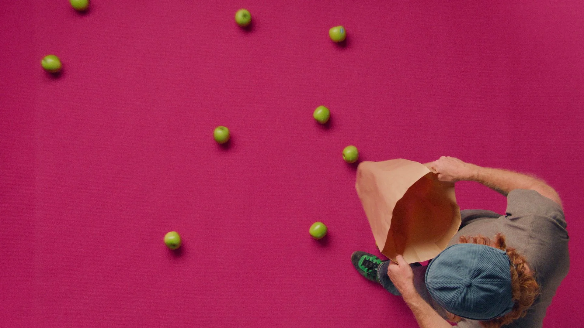 In the video, the artist can be seen putting several kinds of fruit into a paper bag, apparently after they have just fallen out. When he finishes and picks up the bag, it tears, and the fruit spills on the floor, putting him right back where he started.